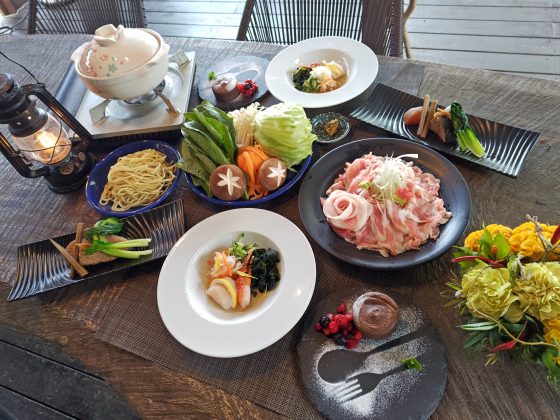 お待ちかねのメインは、特製の塩ベース出汁で味わうしゃぶしゃぶ。上質な国産豚肉と、採れたての旬の地野菜が、あっさりとしていながらも旨味あふれる出汁を纏います。柚子の上品な香りが食欲をそそり、ボリュームがありながらも最後まで飽きさせません。